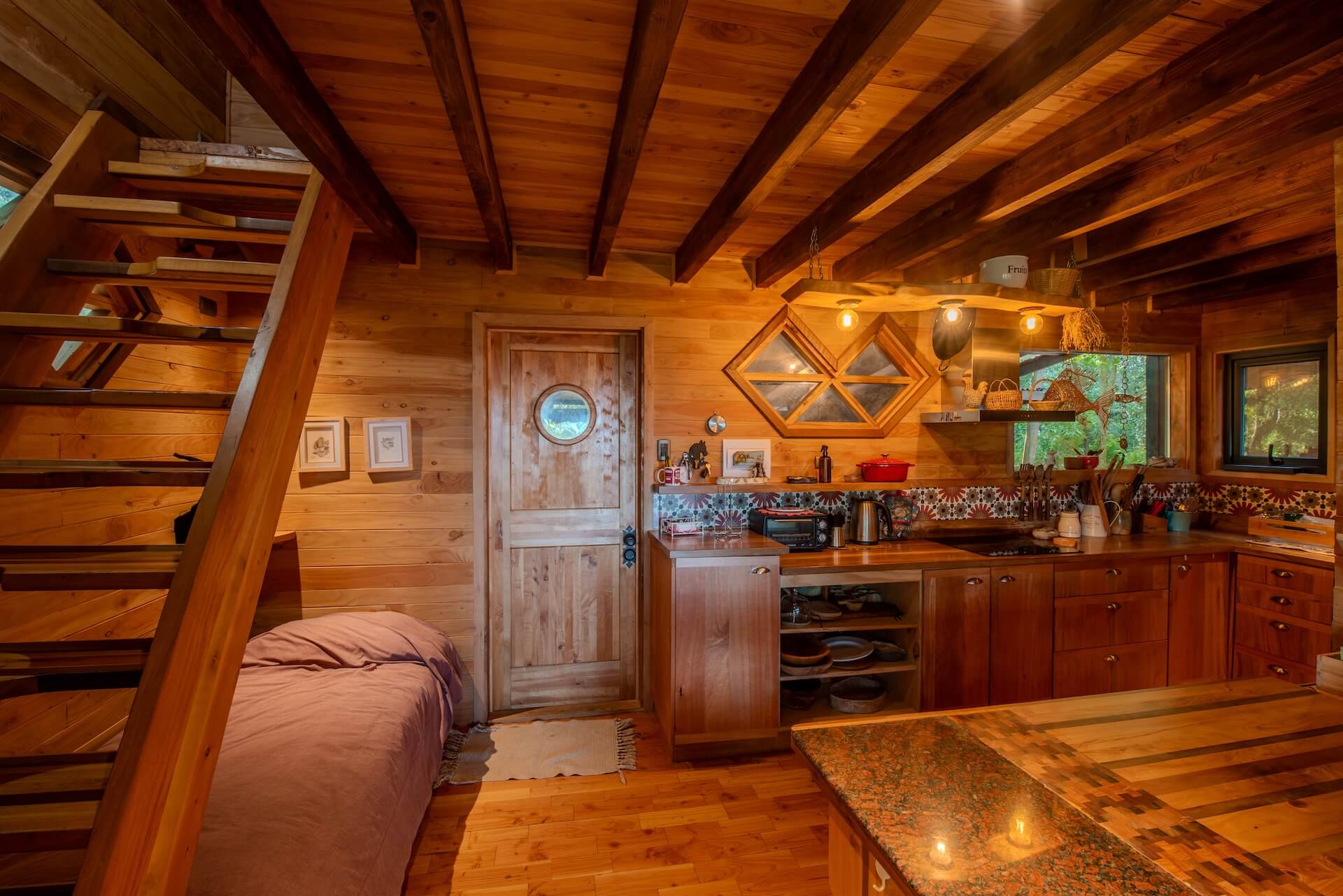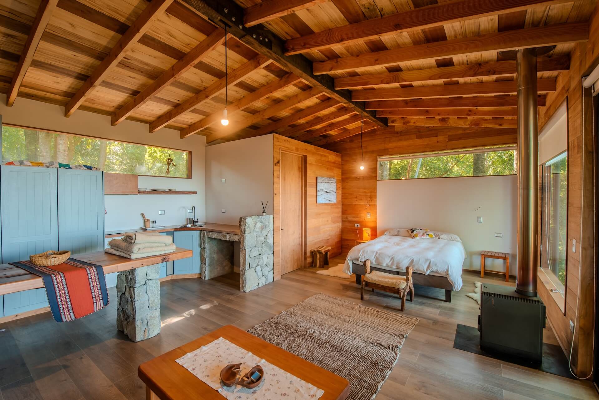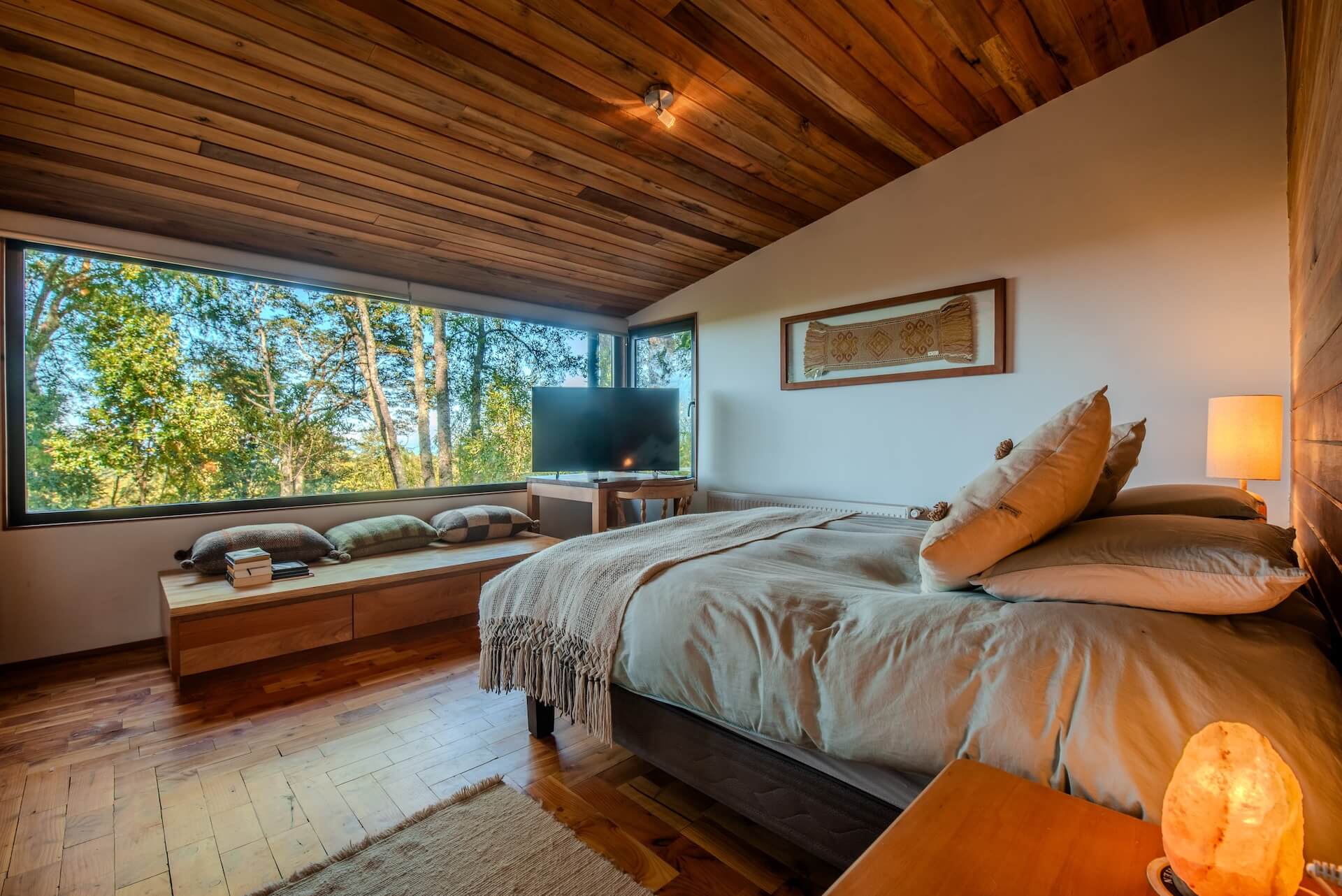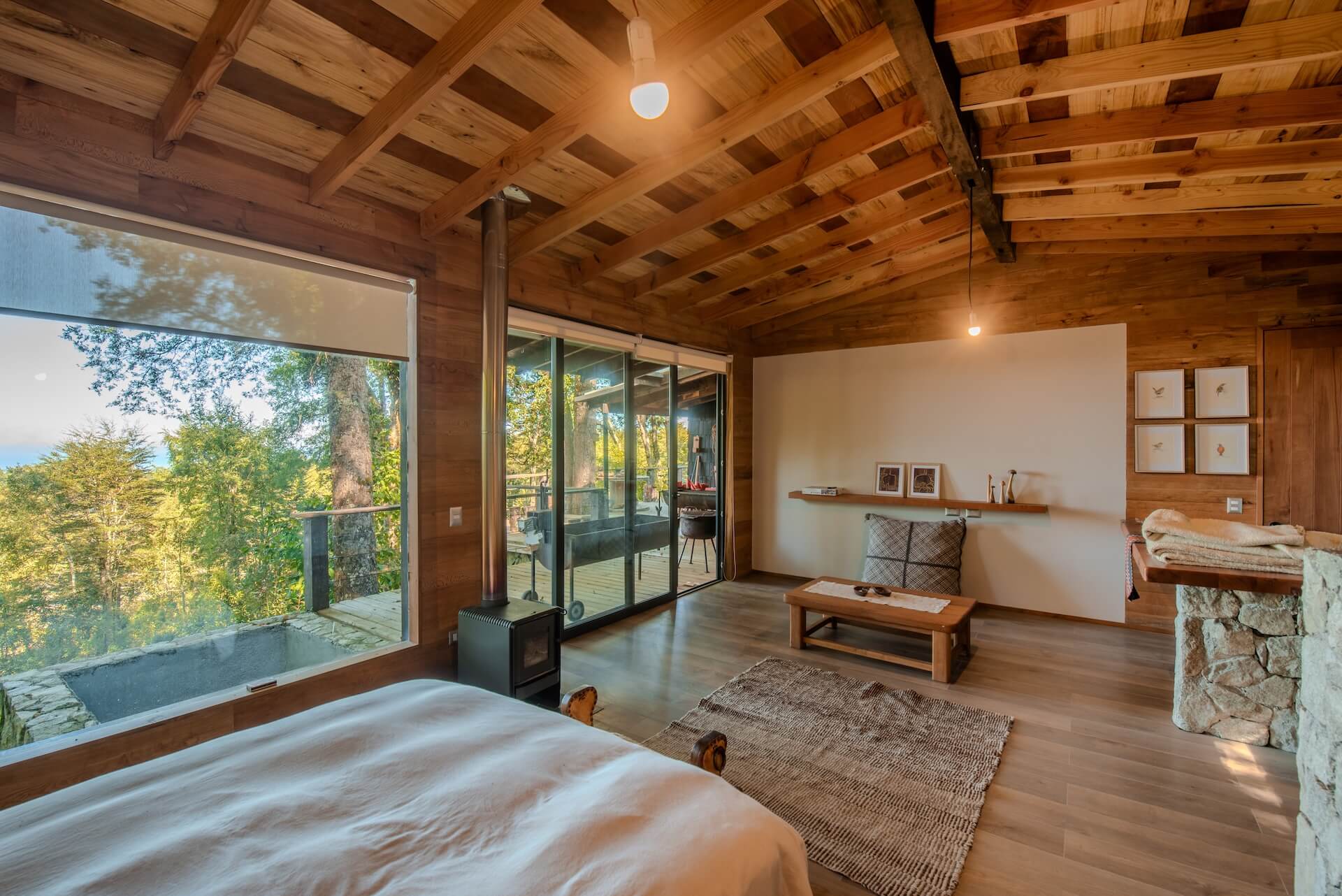 Casa Loma Morchella es una exclusiva residencia ecológica escondida entre bosques centenarios de robles y coigües. Construida íntegramente con maderas recicladas de antiguos galpones patagónicos, esta casa ofrece una experiencia única de conexión profunda con la naturaleza sin renunciar al confort moderno.